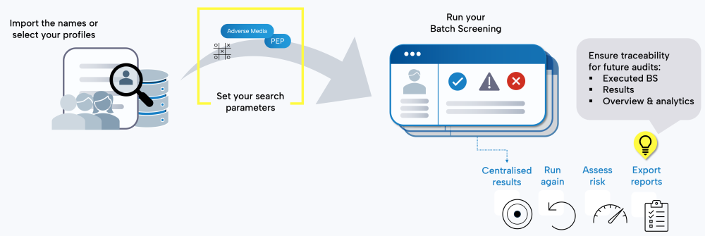 Batch Screening can be used in different operating modes, adapting to existing AML workflows.